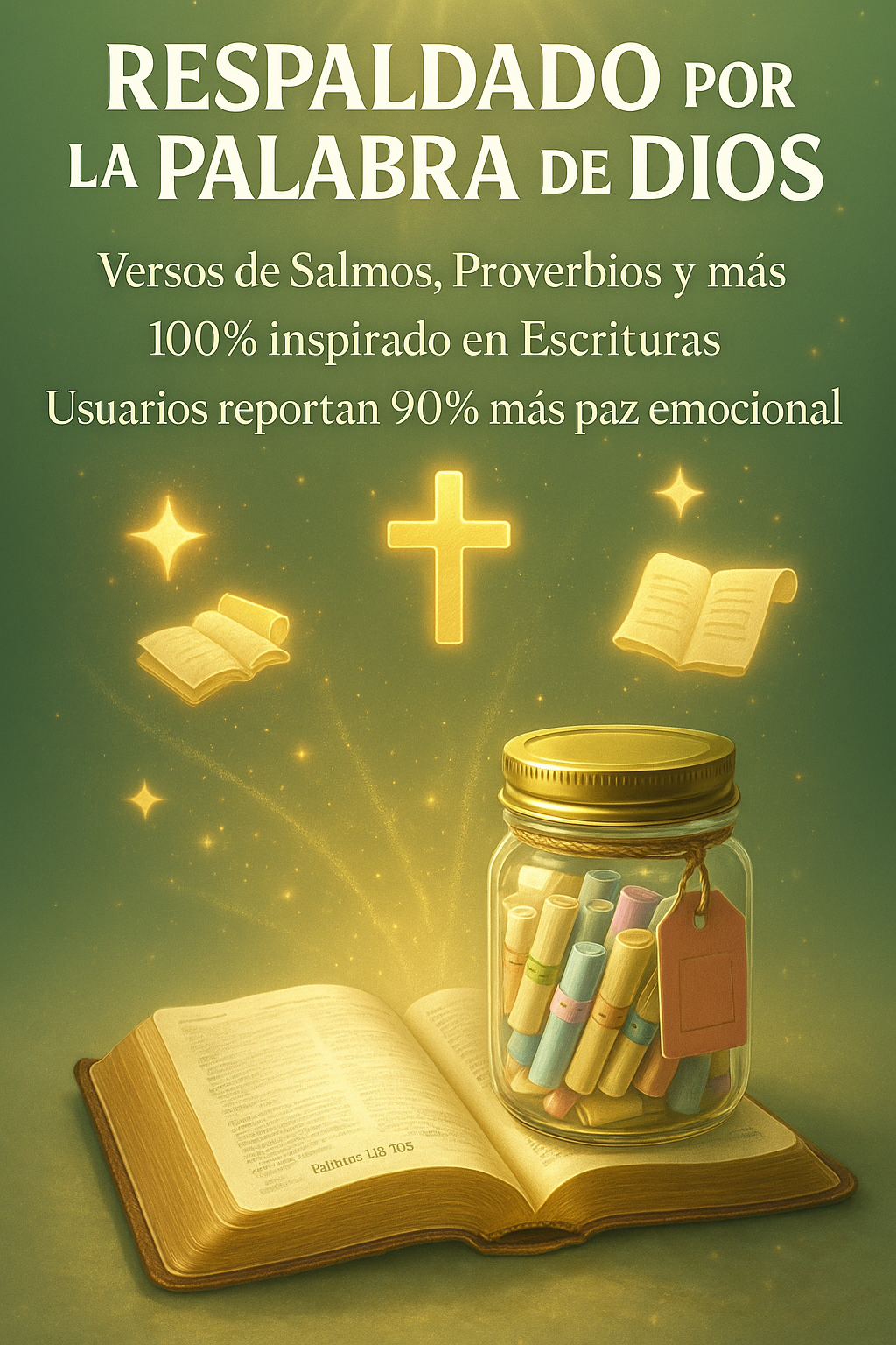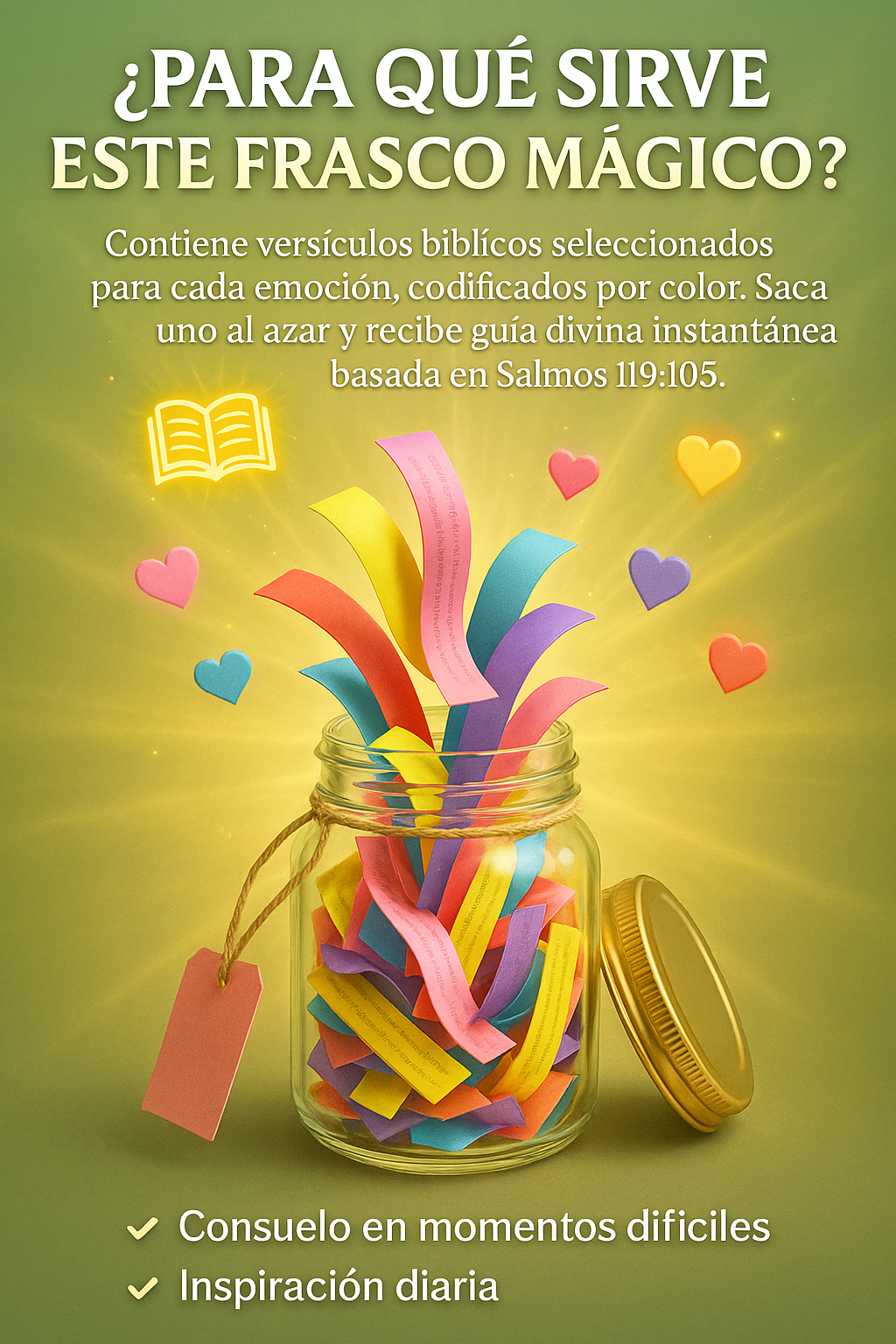 Este frasco viene con papeles o tarjetas que tienen versículos bíblicos escritos, pensados para que puedas extraer uno cada día o en momentos especiales. Está presentado como un detalle bonito tanto para uso personal como para regalar.