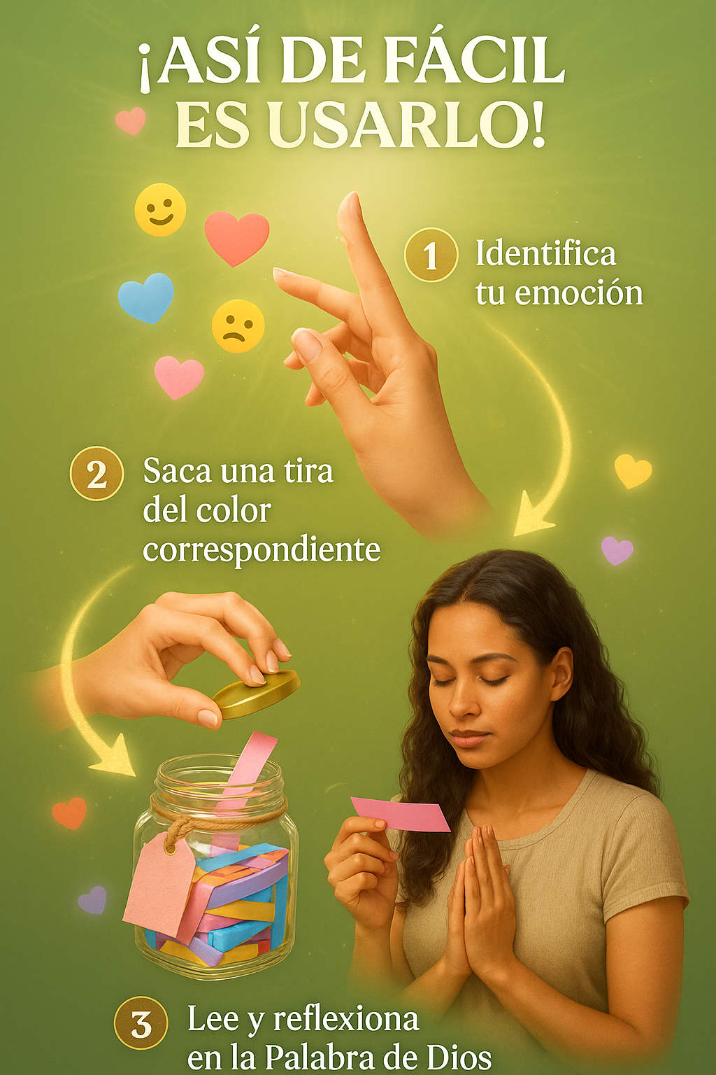 La idea es que saques un papel con un versículo bíblico cada día o cuando lo necesites; al leerlo, puedes reflexionar sobre su mensaje y aplicarlo a tu situación o emoción del momento. Muchos usuarios señalan que les ayuda a mantener una actitud más positiva y conectada con su fe.