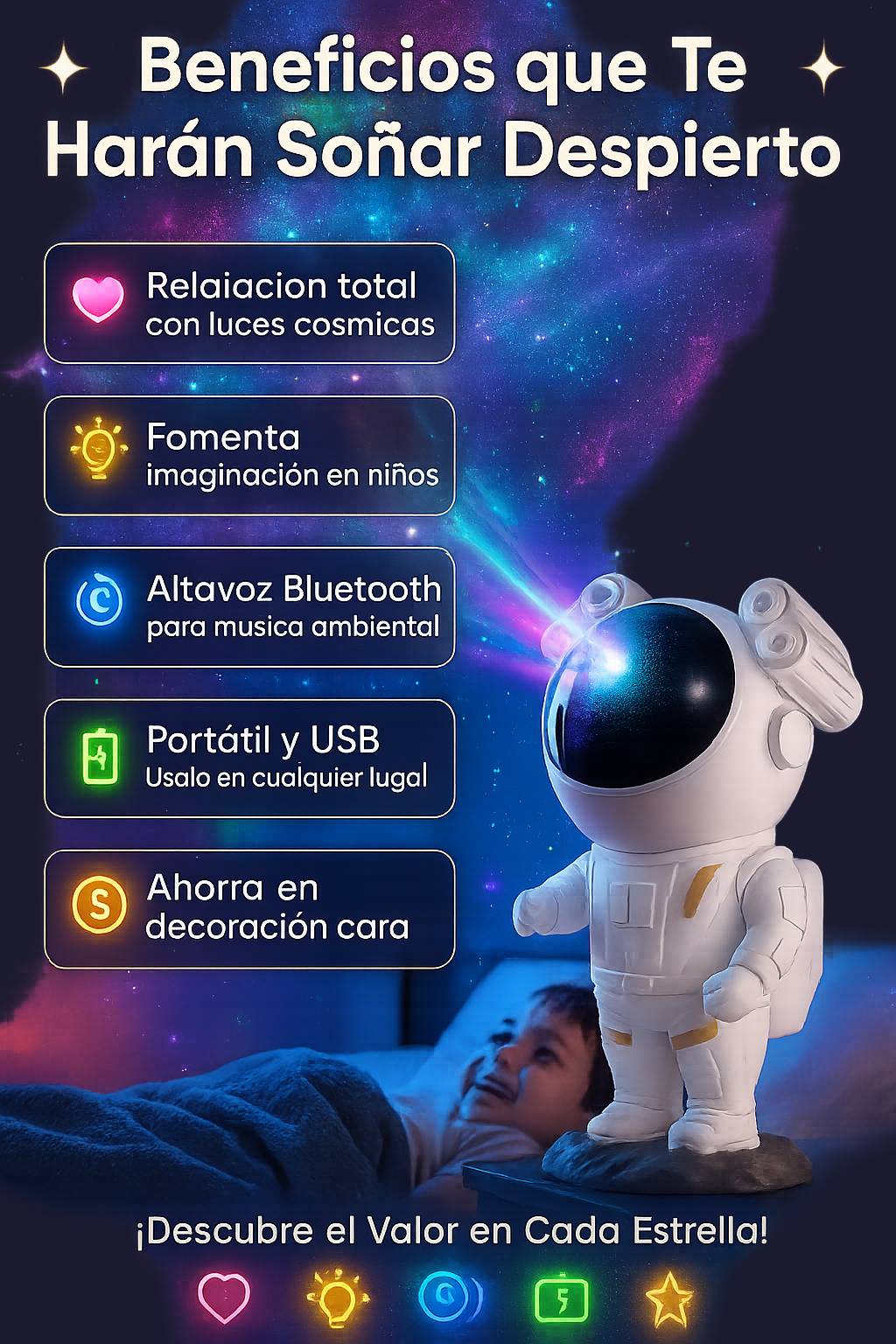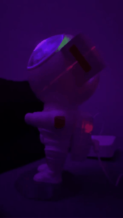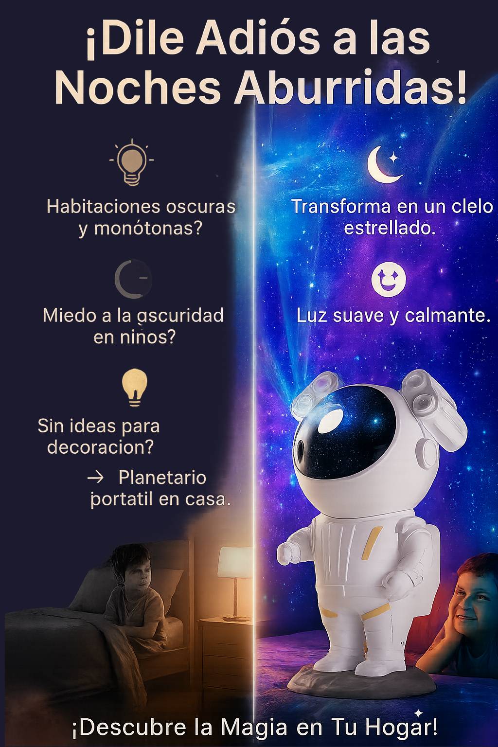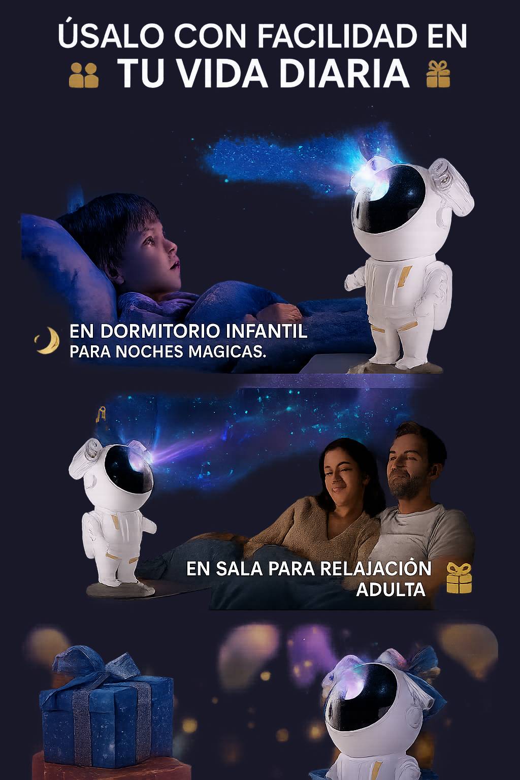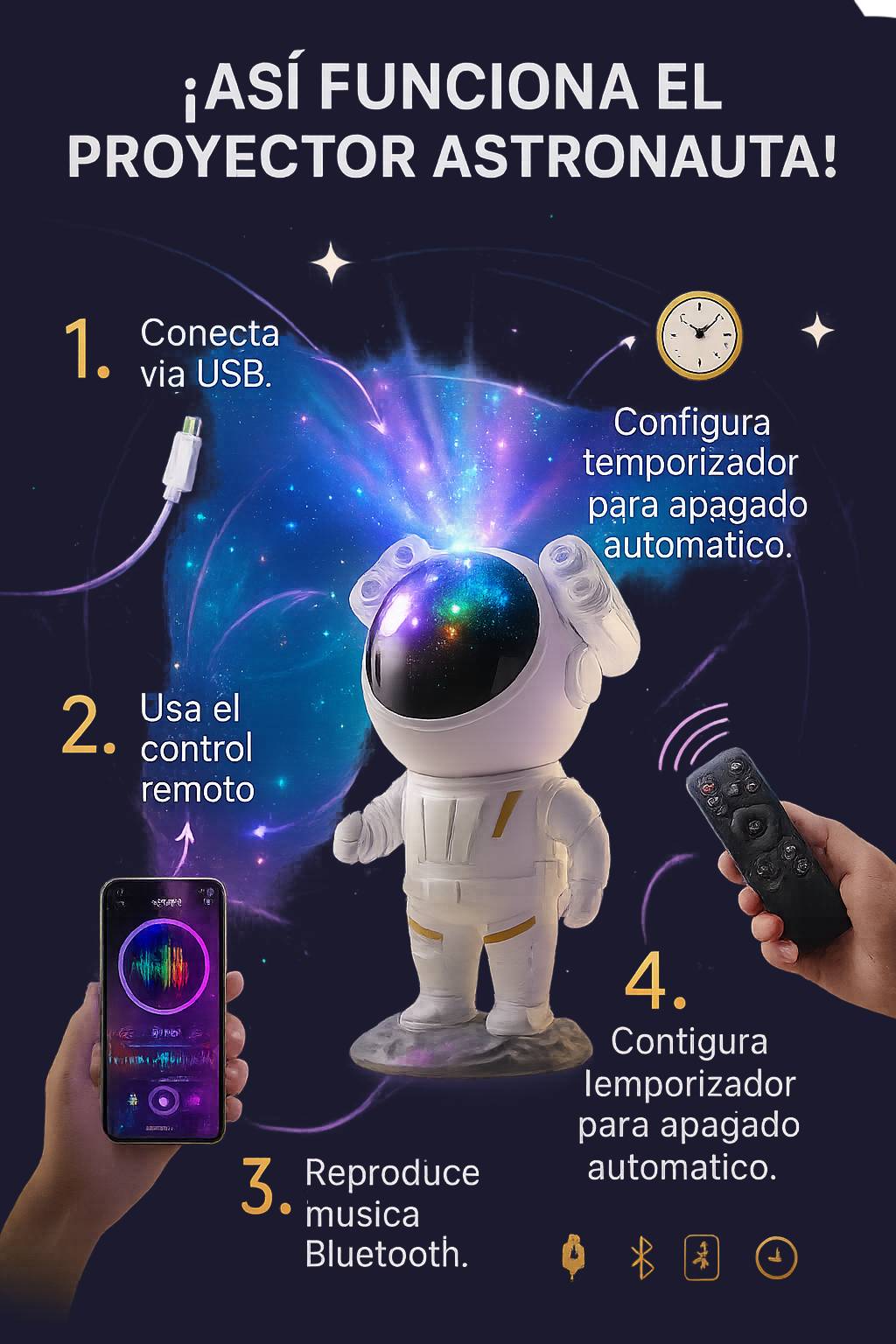 Trae el proyector en forma de astronauta, un control remoto, el cable USB de alimentación y el manual de usuario. (El adaptador de corriente no siempre está incluido).